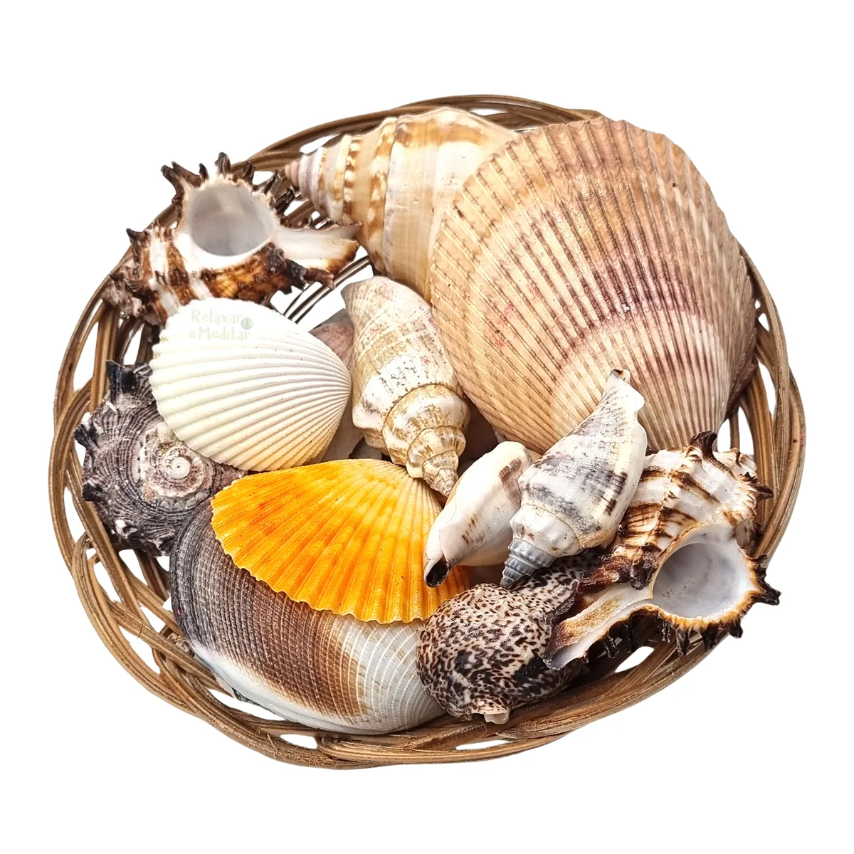 Uma cestinha artesanal para decorar seu ambiente e expor suas conchas favoritas. Este kit é perfeito para decorar ambientes com a temática de praia e mar. Uma grande variedade de conchas de diferentes formas e cores.