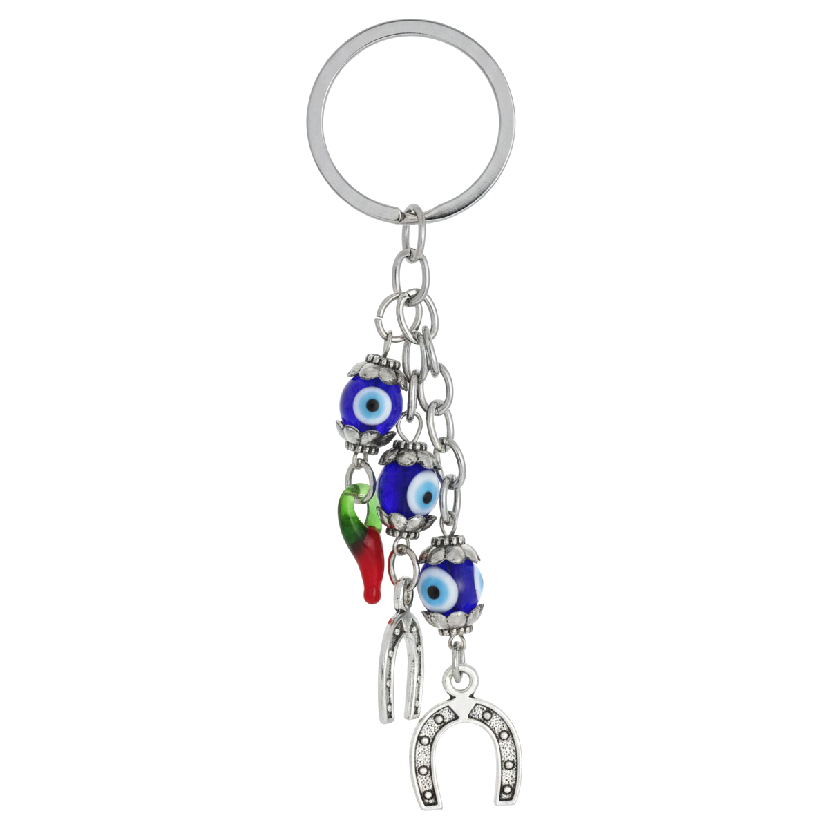 Um amuleto cheio de significado para acompanhar você todos os dias. Reúne pimenta contra energias negativas, olho grego contra mau-olhado e ferraduras simbolizando uma combinação de sorte e proteção.