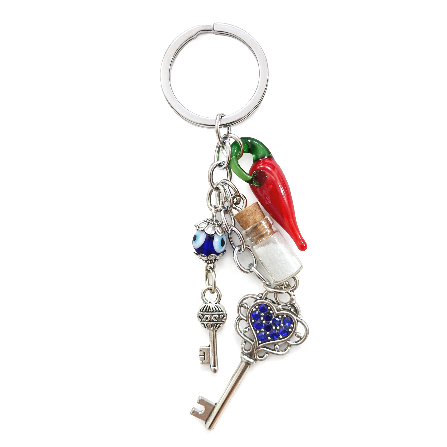 Um amuleto cheio de significado para acompanhar você todos os dias. Reúne pimenta contra energias negativas, sal para purificação, olho grego contra mau-olhado e chave com strass azul simbolizando proteção e abertura de caminhos.