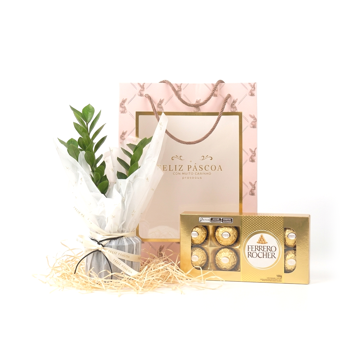 Transforme o dia de alguém especial com o nossa edição limitada de Páscoa com Zamioculca. Cuidadosamente preparado para encantar e surpreender, esse kit traz uma sacola elegante e luxuosa com detalhes dourados e a frase Feliz Páscoa com muito carinho.