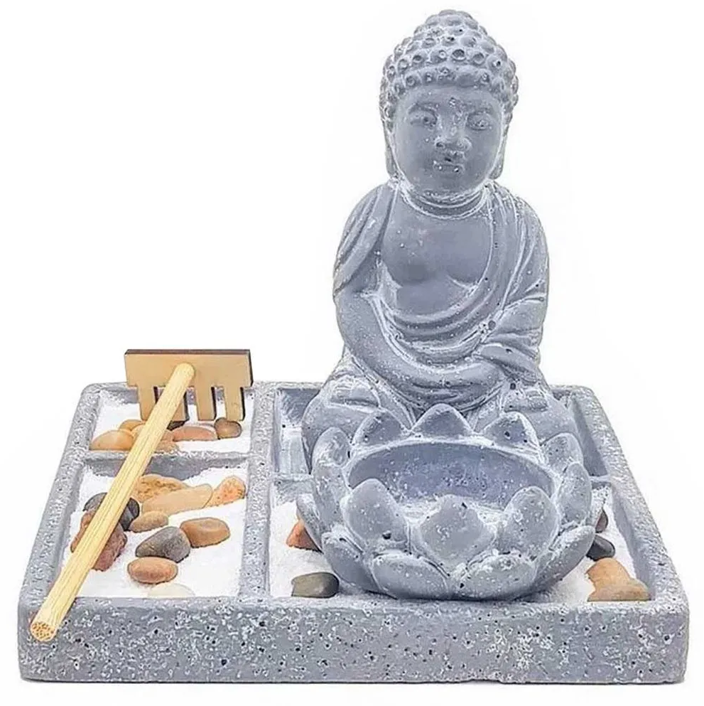 Com base em cimento, este modelo acompanha diversos acessórios para complementar o seu visual, incluindo um porta velas, pedras naturais e uma estátua de Buda.
