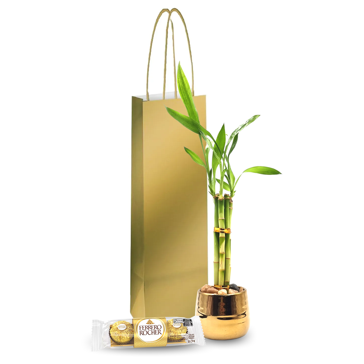 Uma verdadeira celebração de luxo, riqueza e prosperidade, o Kit Presente Ouro com Bambu da Sorte e Chocolate Ferrero Rocher é a escolha perfeita para quem deseja transmitir não apenas carinho, mas também um toque de sofisticação e boas energias.