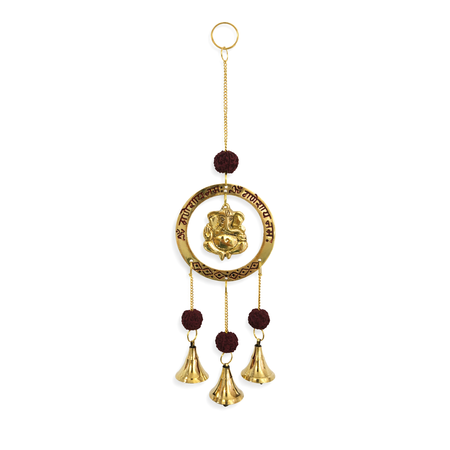 Leve proteção, harmonia e boas energias ao seu ambiente com este delicado móbile indiano de Ganesha, o deus removedor de obstáculos e símbolo de prosperidade. Confeccionado em metal dourado com acabamento brilhante, ele traz um elegante aro com inscrições em sânscrito, detalhes ornamentais e sinos suspensos que produzem um som suave e acolhedor ao menor movimento. As sementes naturais de rudraksha adicionam um toque espiritual autêntico e sofisticado à peça.