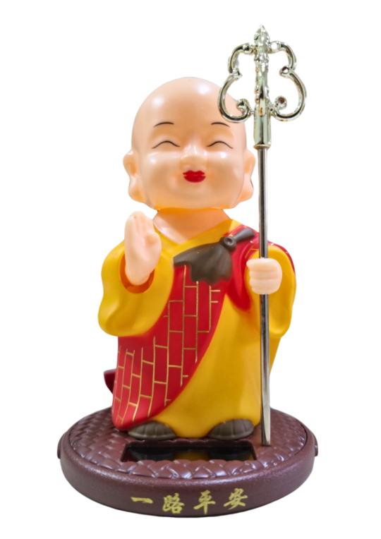 Um encantador monginho para abençoar e decorar qualquer ambiente. Usando energia solar que dispensa pilhas ou baterias ele move a cabeça e a mão com um delicado movimento.