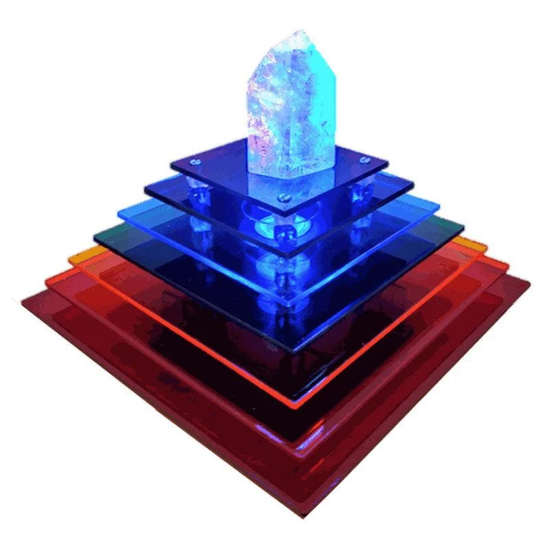 A luz cromática situado no centro da pirâmide, faz com que o cristal existente no topo mude de cor a medida que gira, amplificando e irradiando, por intermédio do cristal, ondas de equilíbrio através de suas cores.